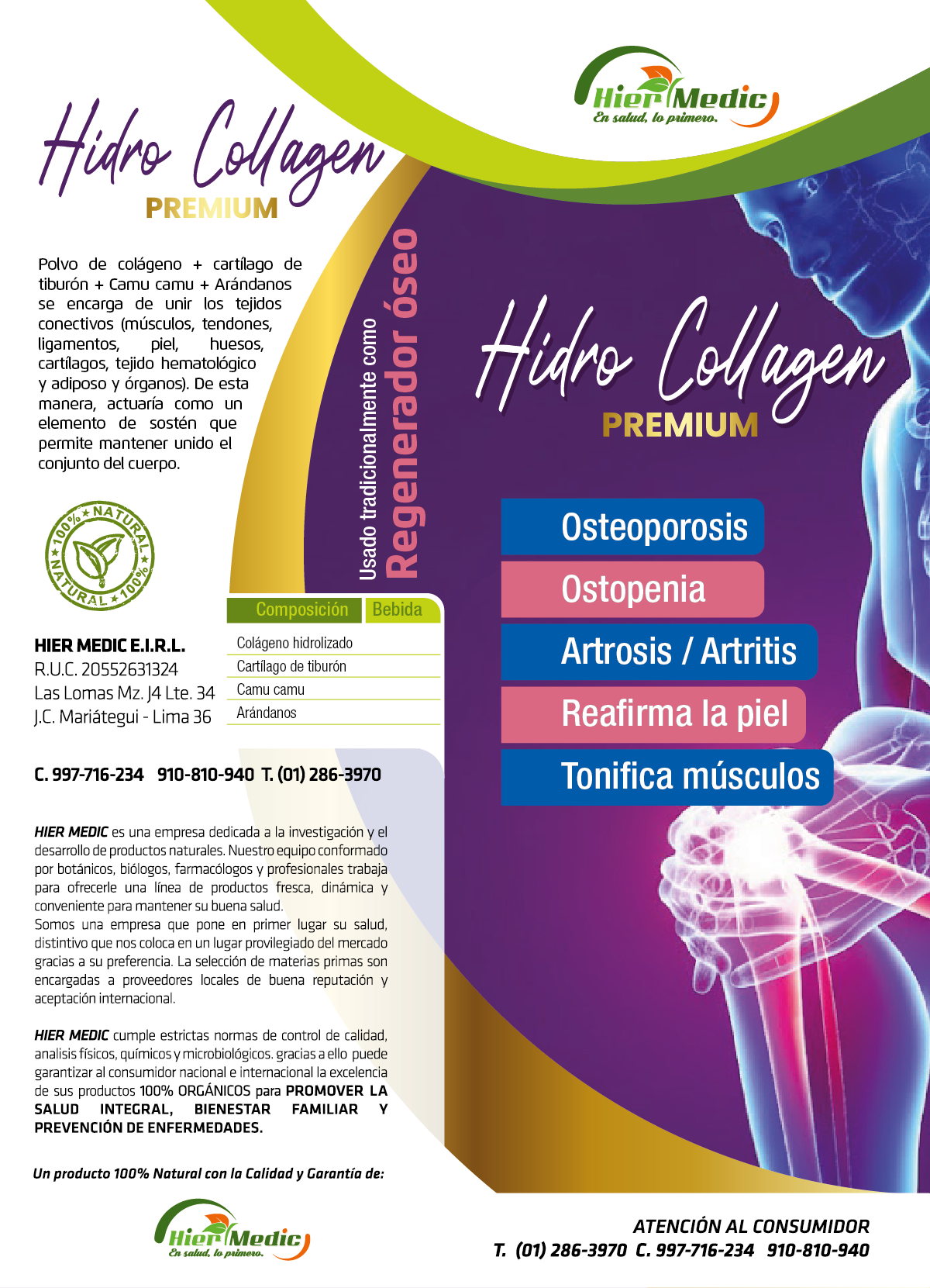 Hidro Collagen Premium es un suplemento natural de alta calidad diseñado para regenerar y fortalecer el sistema óseo, articular y muscular. Su fórmula combina colágeno marino, cartílago de tiburón y potentes antioxidantes naturales que trabajan en conjunto para revertir el deterioro óseo, mejorar la movilidad articular y rejuvenecer la piel.